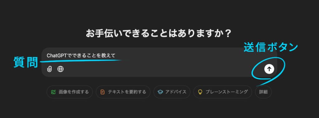 『送信ボタン(丸の中に「↑」)』を押すと、AI(ChatGPT)が答えてくれる