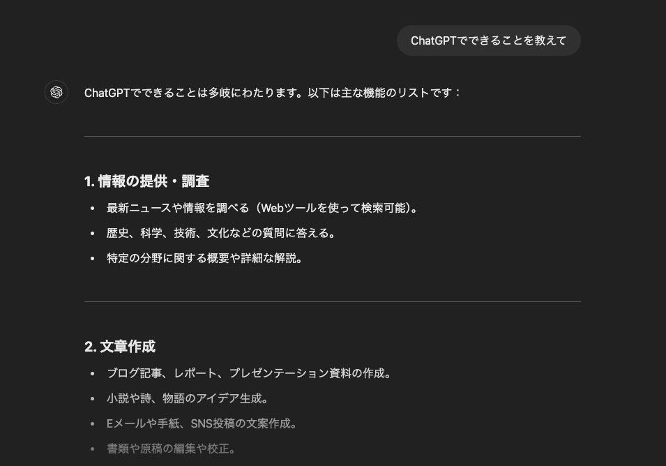 とりあえず『ChatGPTでできることを教えて』って聞いてみんのもおすすだ